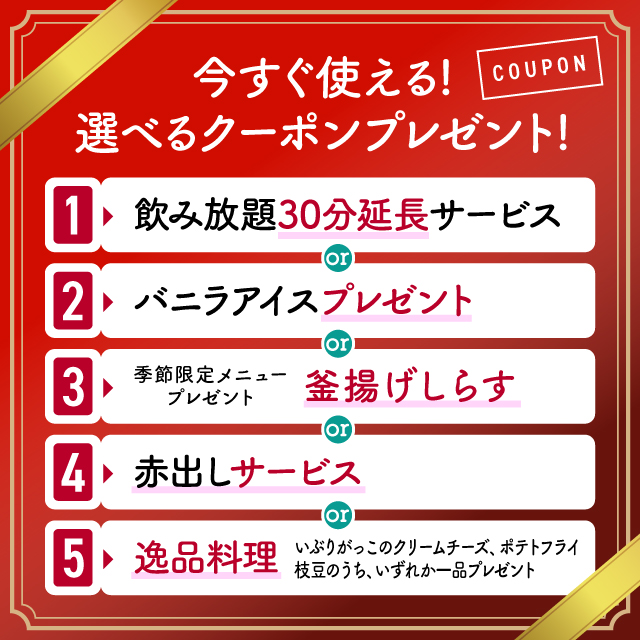 ◆ビール 瓶ビール(アサヒ)/ノンアルコールビール(ドライゼロ) ◆焼酎 二階堂(麦)/黒霧島(芋) ◆チューハイ レモン/ライム/すだち/カルピス/ゆず/南高梅/あんず/巨峰/ウーロンハイ ◆カクテル ジンリッキー/カシスオレンジ/ウォッカトニック/モスコミュール/ カシスソーダ/ジントニック/ビッグアップル/スクリュードライバー ◆ウイスキー 水割り・お湯割り・ロック・ハイボール ◆日本酒 賀茂鶴(熱燗・常温) ◆ワイン 赤/白 ◆ソフトドリンク オレンジ/グレープフルーツ/アップル/ジンジャーエール カルピス/コーラ/ウーロン茶 ※中学生~未成年ソフトドリンクのみで+1,980円、小学生以下の方+330円